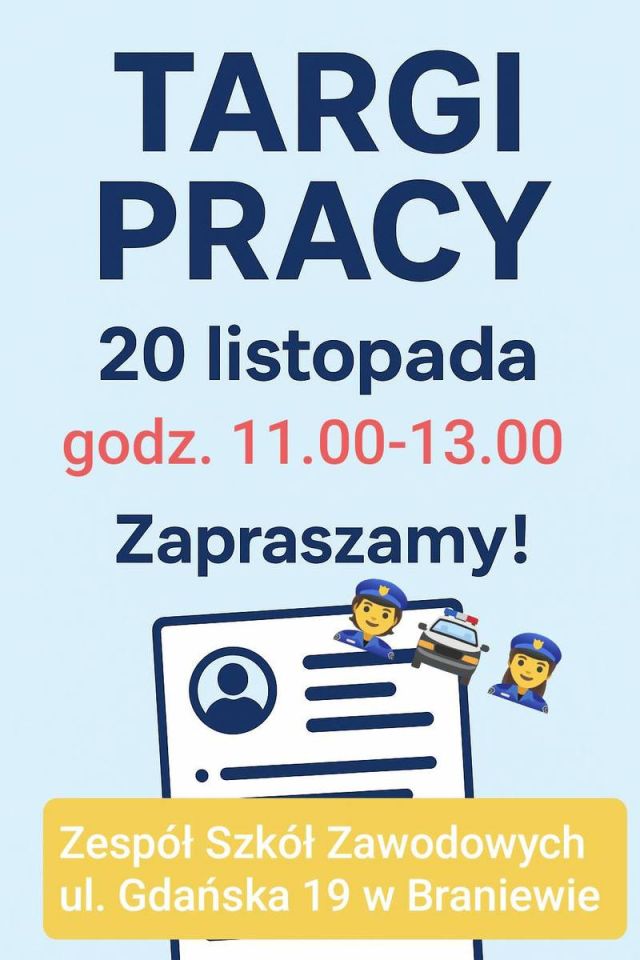 - Termin i miejsce: Braniewskie Targi Pracy, 20 listopada, godz. 11:00 do 13:00.